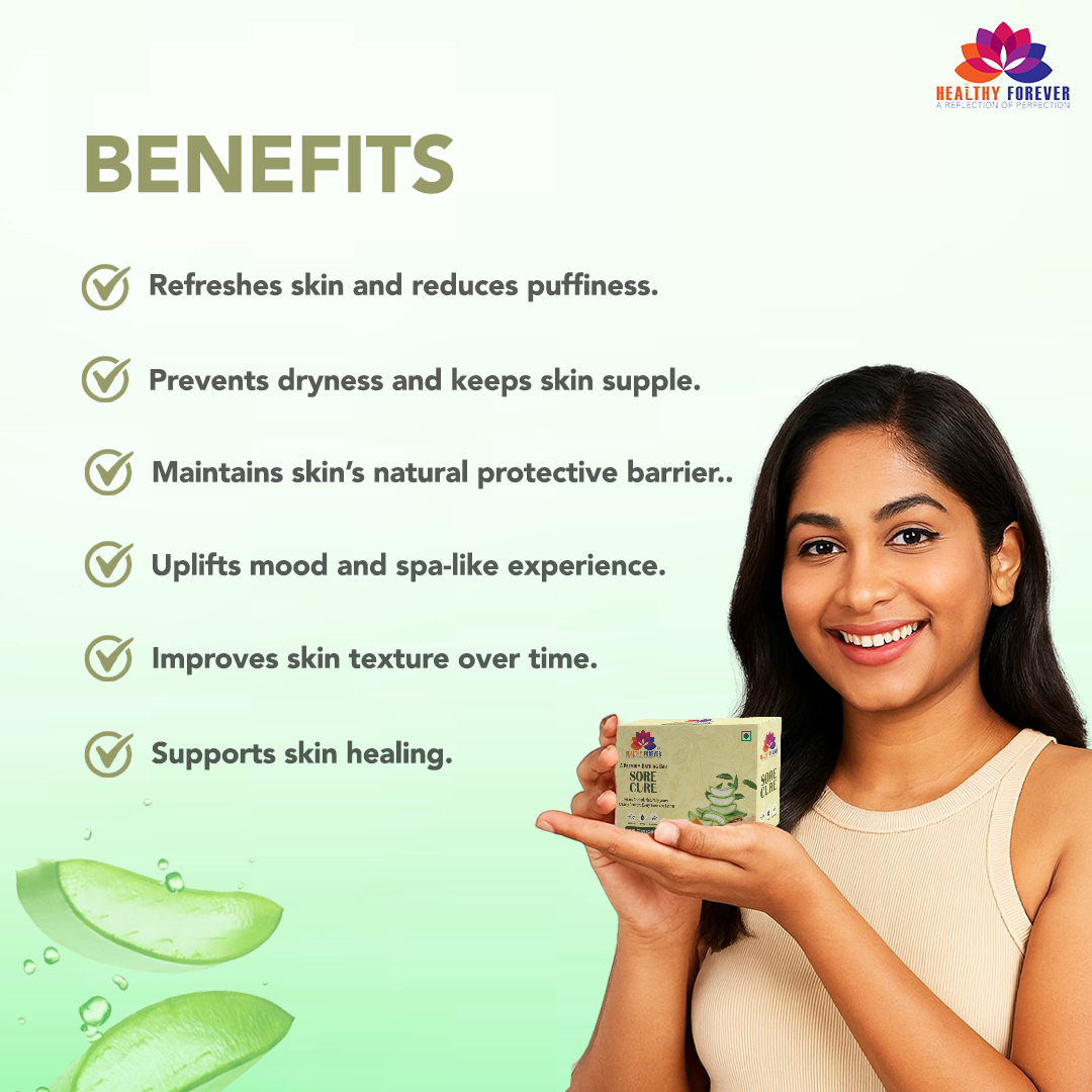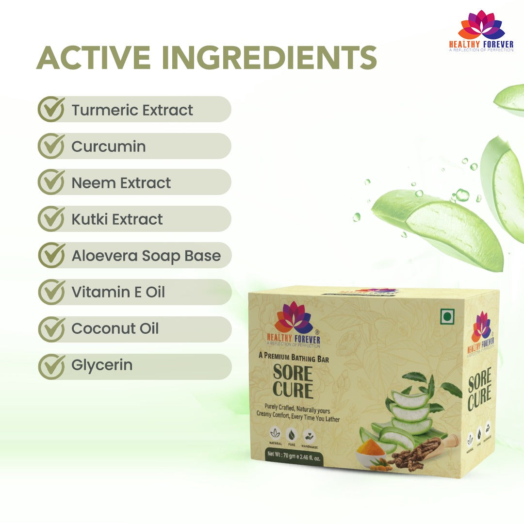 Healthy Forever: Sore Cure is a premium, handcrafted bathing bar designed to provide a "creamy comfort" with every lather. Meticulously made in India, this soap is formulated with high-quality natural extracts to repair, hydrate, and soothe the skin. It is dermatologically trusted and free from harsh chemicals like parabens and sulfates.