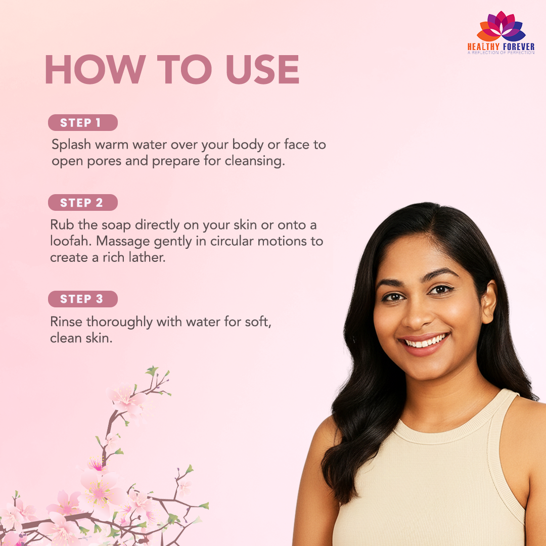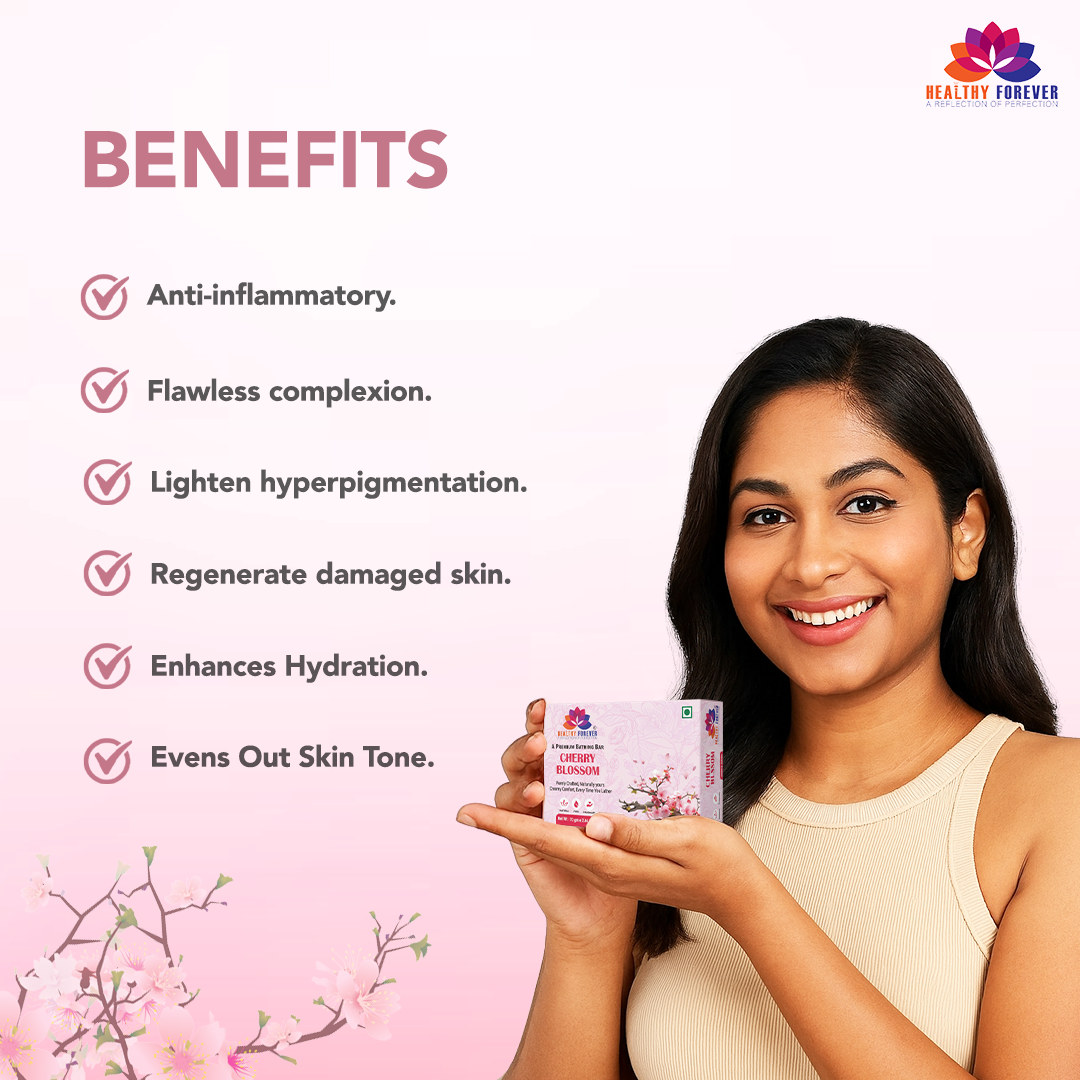 The Healthy Forever Cherry Blossom Premium Bathing Bar is a meticulously crafted, handmade soap designed to provide a luxurious and skin-repairing cleansing experience. Infused with the delicate essence of Cherry Blossom and a blend of nourishing oils, this bathing bar aims to transform your daily shower into a spa-like ritual.