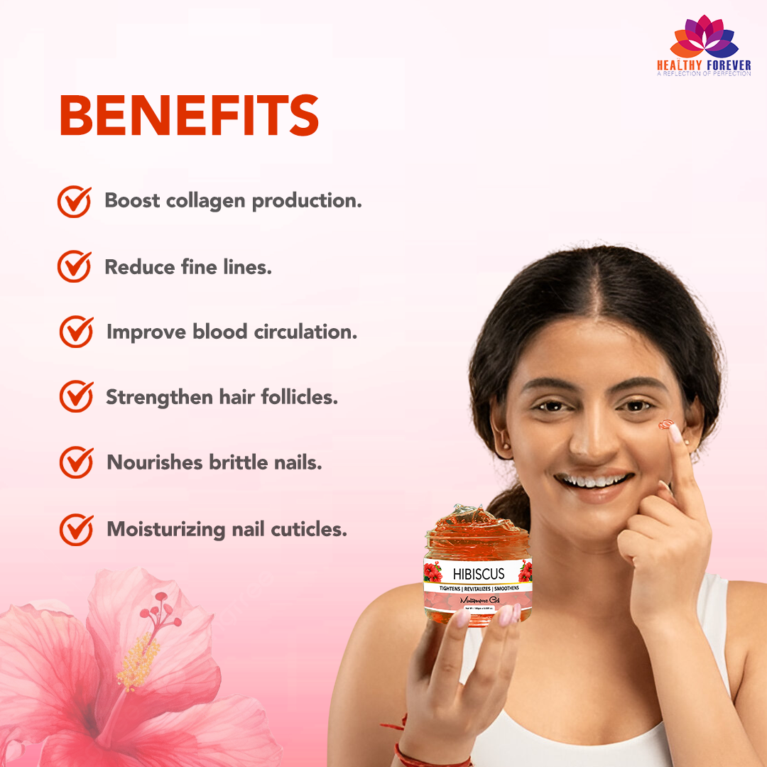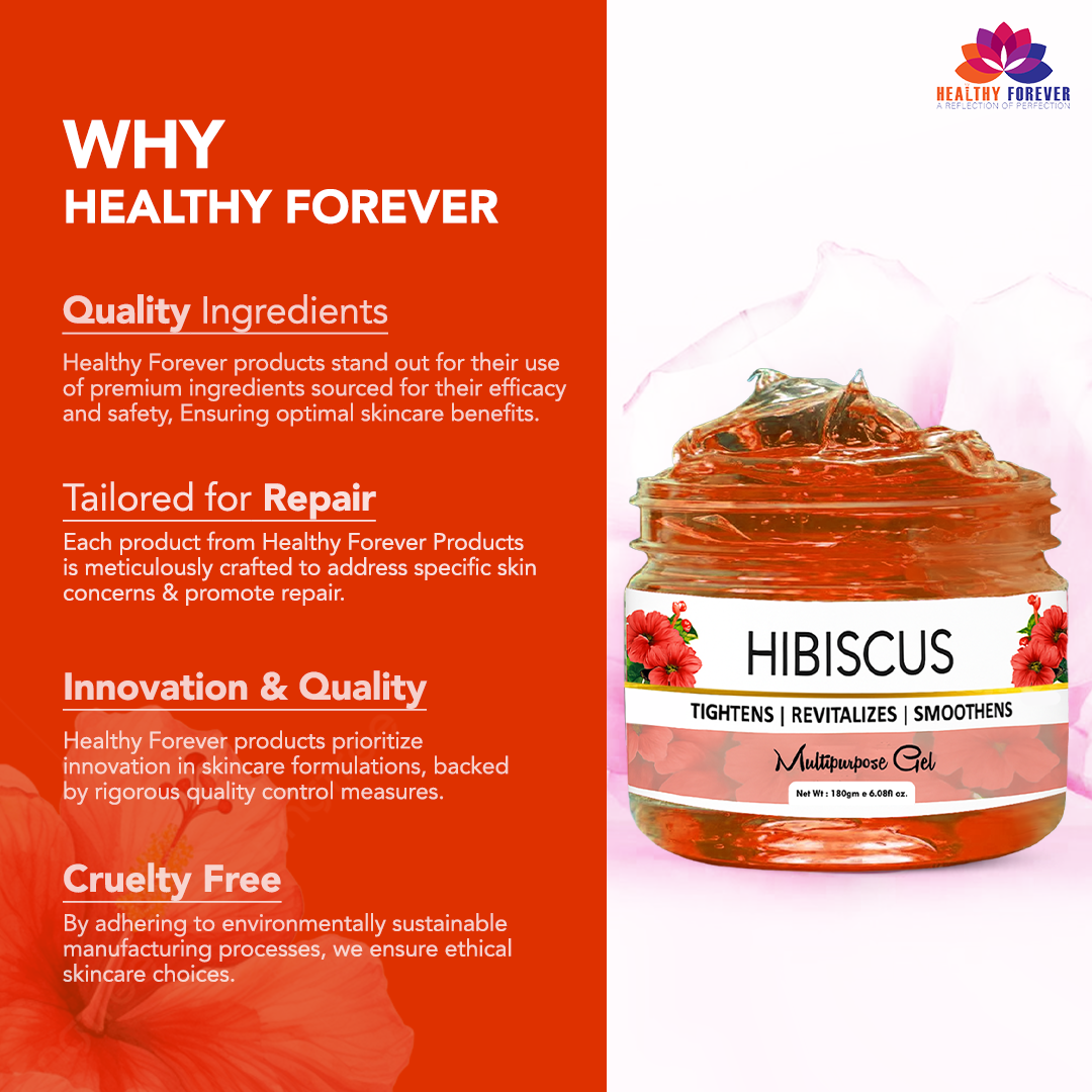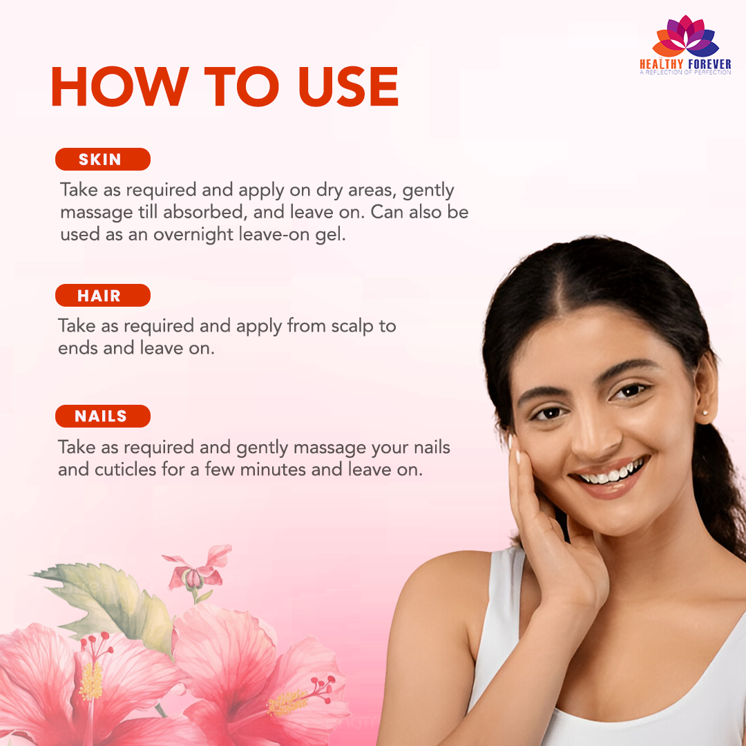 Healthy Forever Homemade Hibiscus Gel with Pure Aloe Vera is a lightweight, non-greasy, non-sticky, refreshing face gel. It imparts instant refreshment to the skin with a non-sticky after-feel It helps reduce scars, sunburn, redness, wrinkles signs of aging and It also protects the skin, soothes the skin from rashes, and irritation, also nourishes your skin Lightens blemishes Brightens skin tone Moisturizes the skin Soothes fine lines & wrinkles Helps reduces the stretch marks It minimizes the appearance of pores and helps in restricting the dirt and impurities from entering the pores