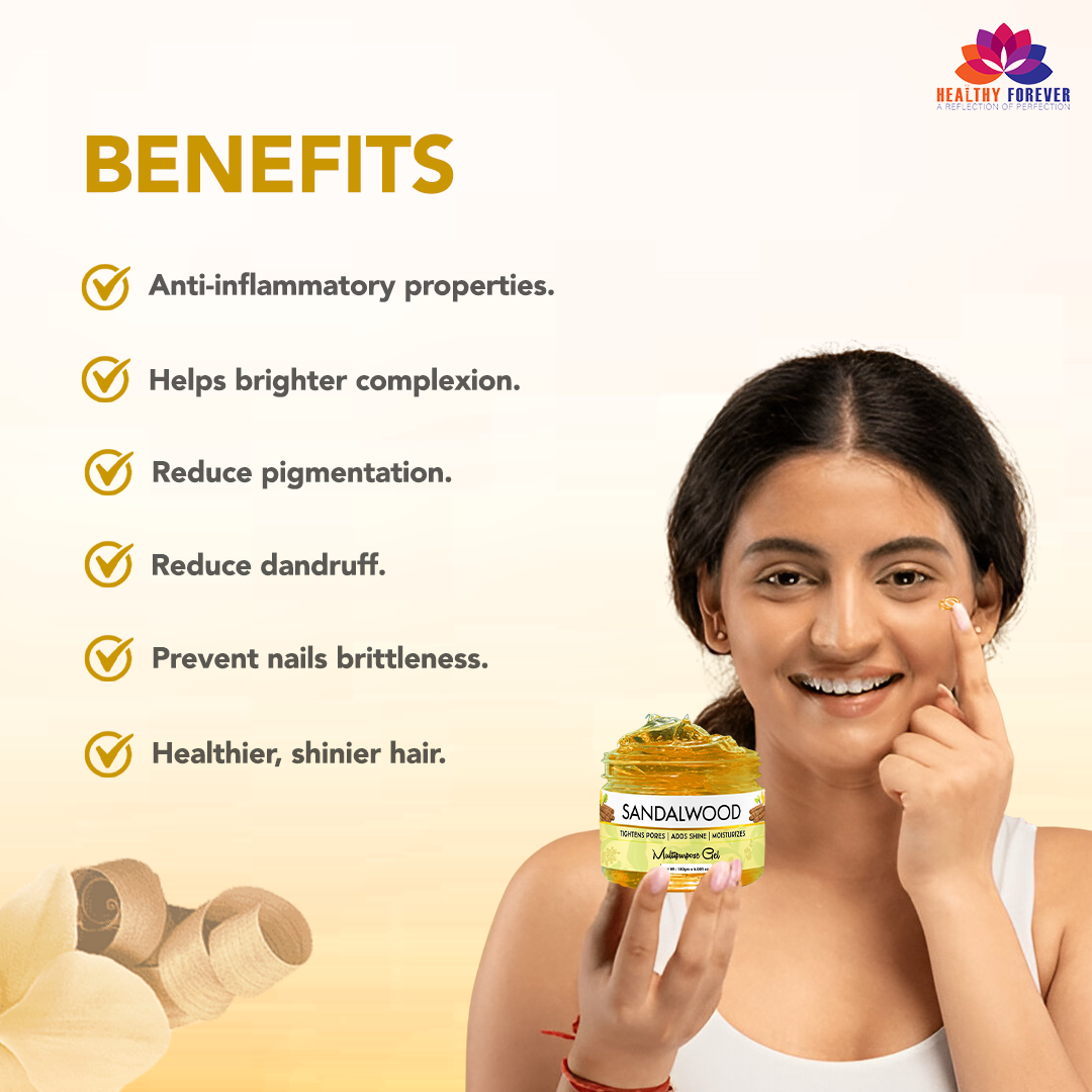 Healthy forever SANDALWOOD ALOE VERA gel is a lightweight, non-greasy, non-sticky, refreshing face gel. It imparts instant refreshment to the skin with a non-sticky after-feel It helps reduce scars, sunburn, redness, wrinkles signs of aging and It also protects the skin, soothes the skin from rashes, and irritation, also nourishes your skin Lightens blemishes Brightens skin tone Moisturizes the skin Soothes fine lines & wrinkles Helps reduces the stretch marks It minimizes the appearance of pores and helps in restricting the dirt and impurities from entering the pores