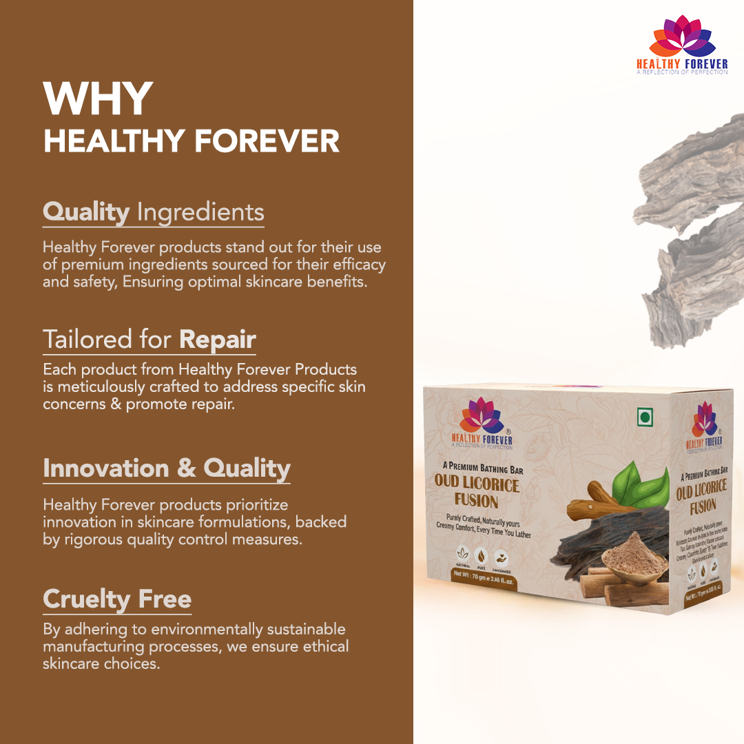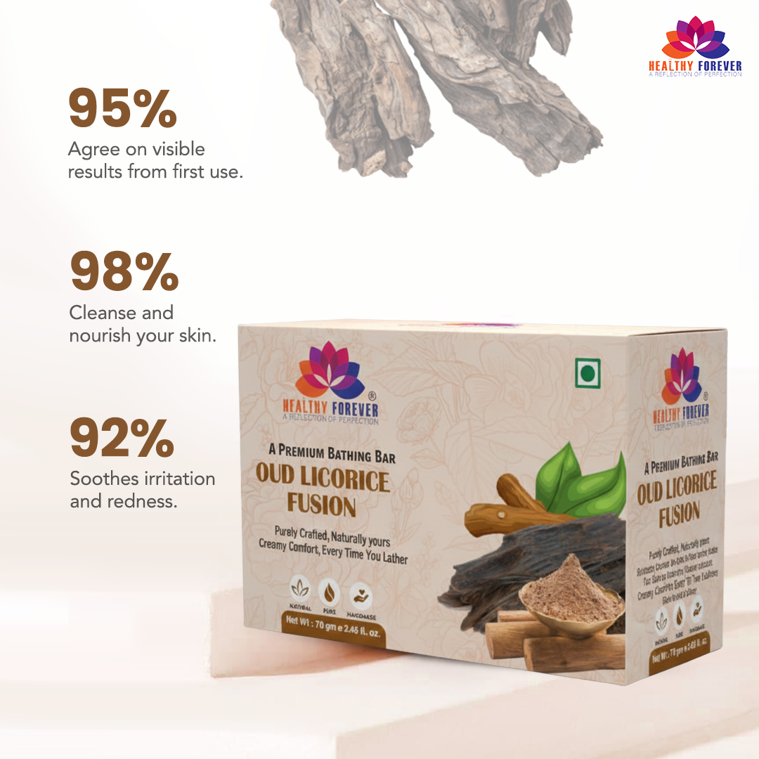The Oud Licorice Fusion is a premium, handcrafted bathing bar designed to provide "creamy comfort" with every use. It combines traditional botanical extracts with modern skincare science to deeply cleanse, nourish, and repair the skin. Made in India and trusted by dermatologists, this bar is formulated to be gentle yet effective for all skin types.