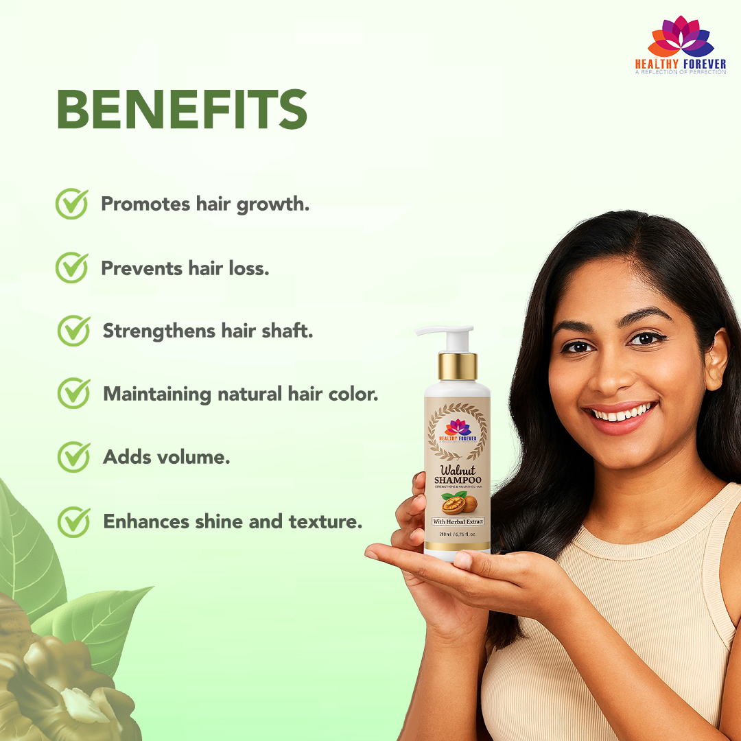 Healthy Forever Walnut Shampoo is enriched with the goodness of walnut and herbal extracts to gently cleanse the scalp while nourishing hair from root to tip. Its herbal-based formula helps strengthen weak strands, reduce hair fall, and restore natural shine and texture. Regular use supports healthy hair growth, adds volume, and helps maintain your natural hair color, leaving hair soft, silky, and revitalized.